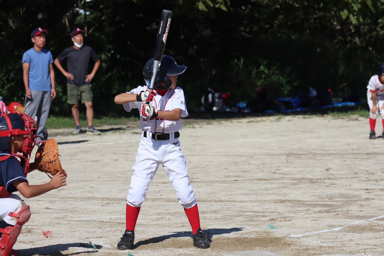🔻キャッチャーくん、4年生のお兄ちゃんたちからプロテクターをつけてもらって初めてのキャッチャーデビューです👏