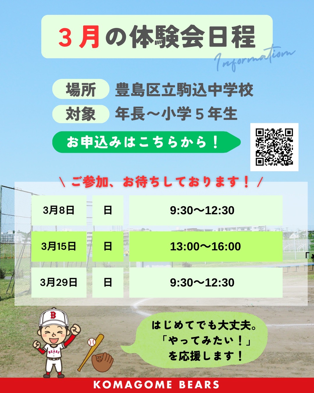 駒込ベアーズ体験会のお知らせです。