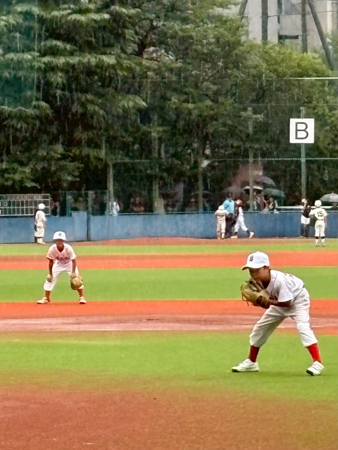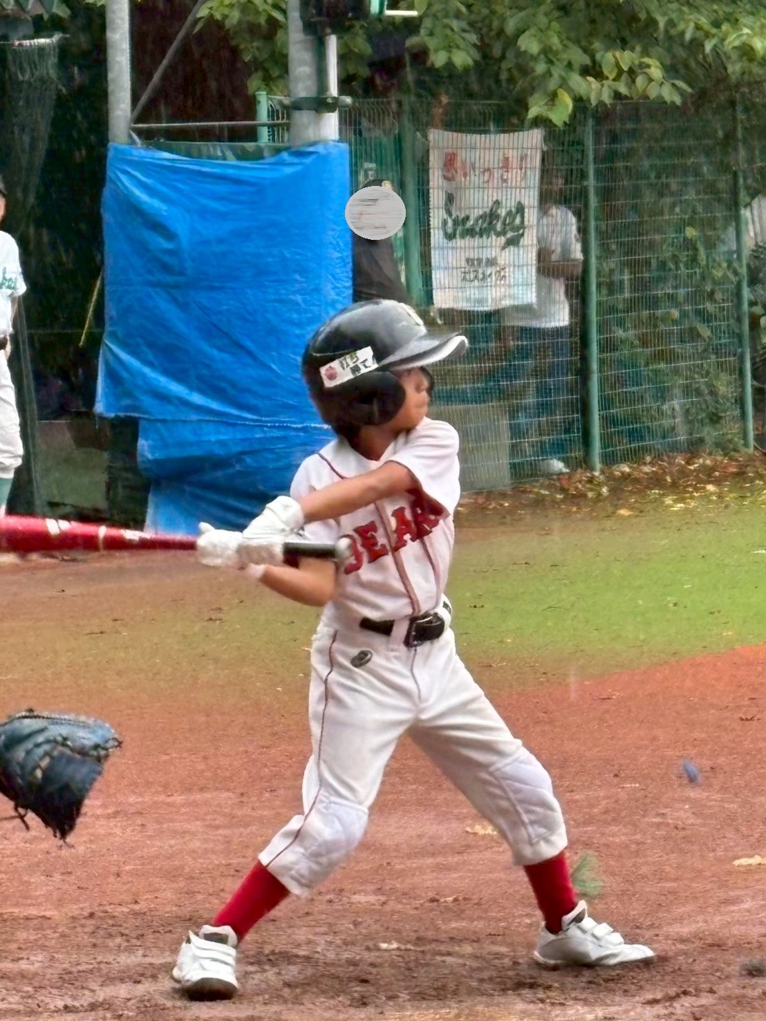 低学年の夏大会は、雨で始まりました。試合開始時から小雨が降っていましたが、天気予報どおりだんだん強くなっていきます。