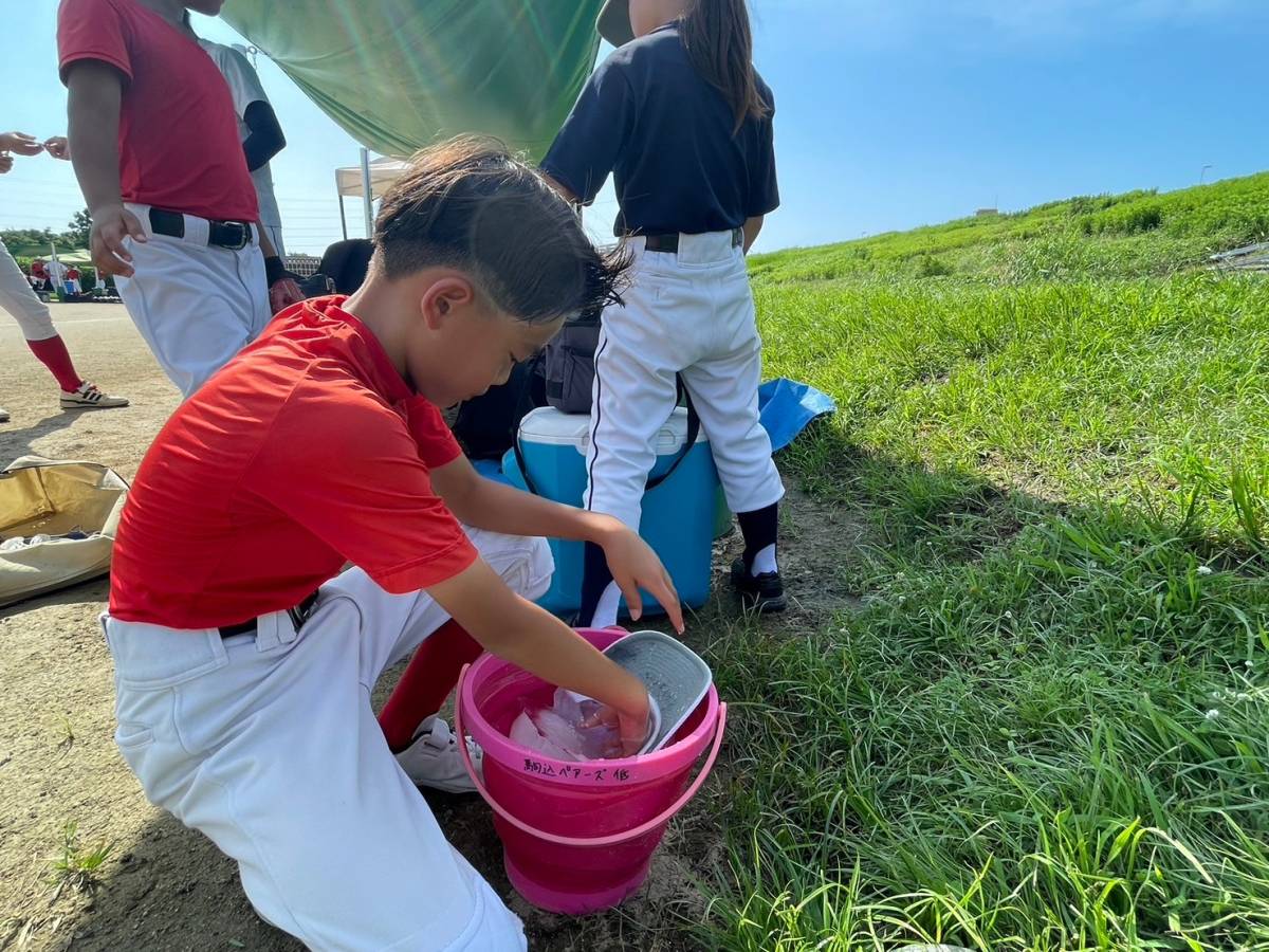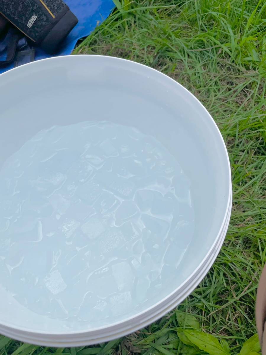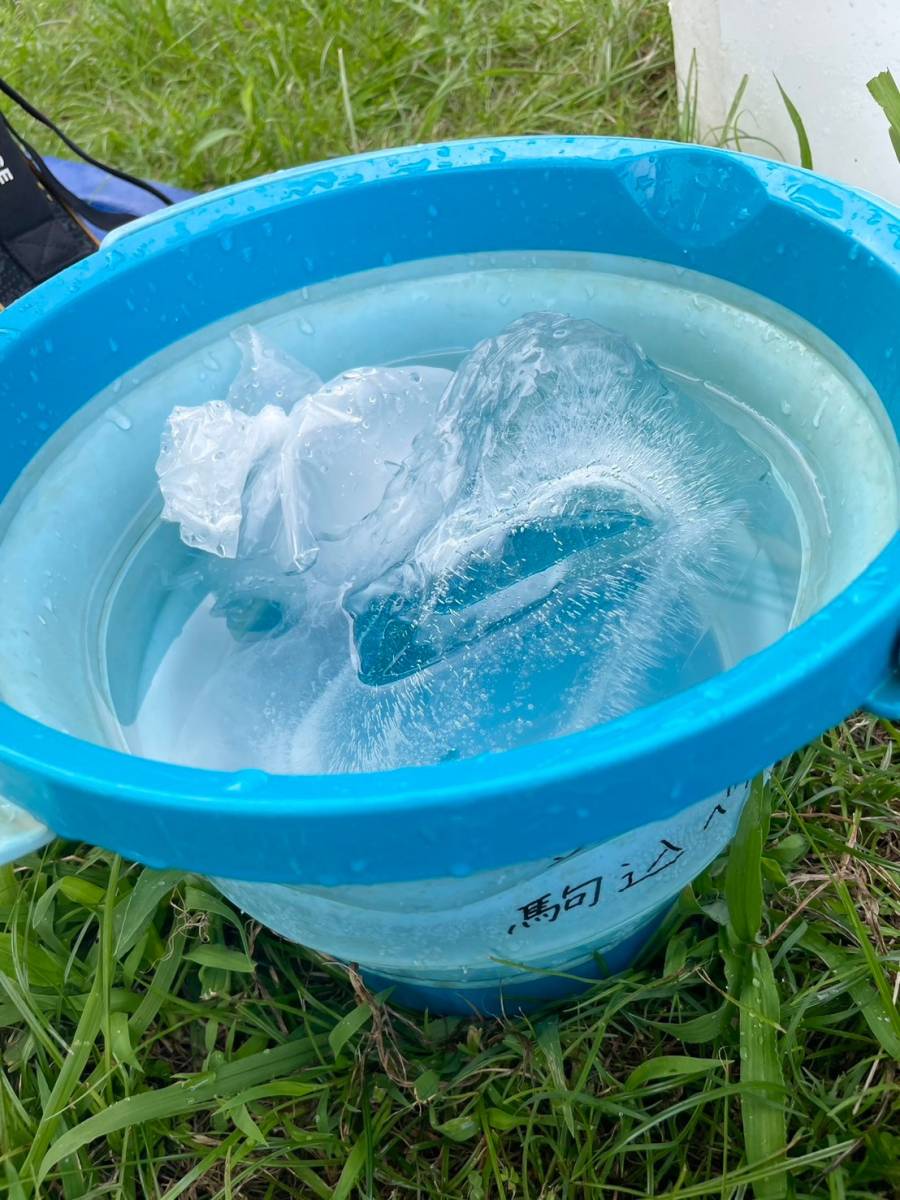 持ってきた氷でバケツに氷水を作り、帽子を濡らしたり、手を冷やしたりして、体に熱をこもらせないようにしています。