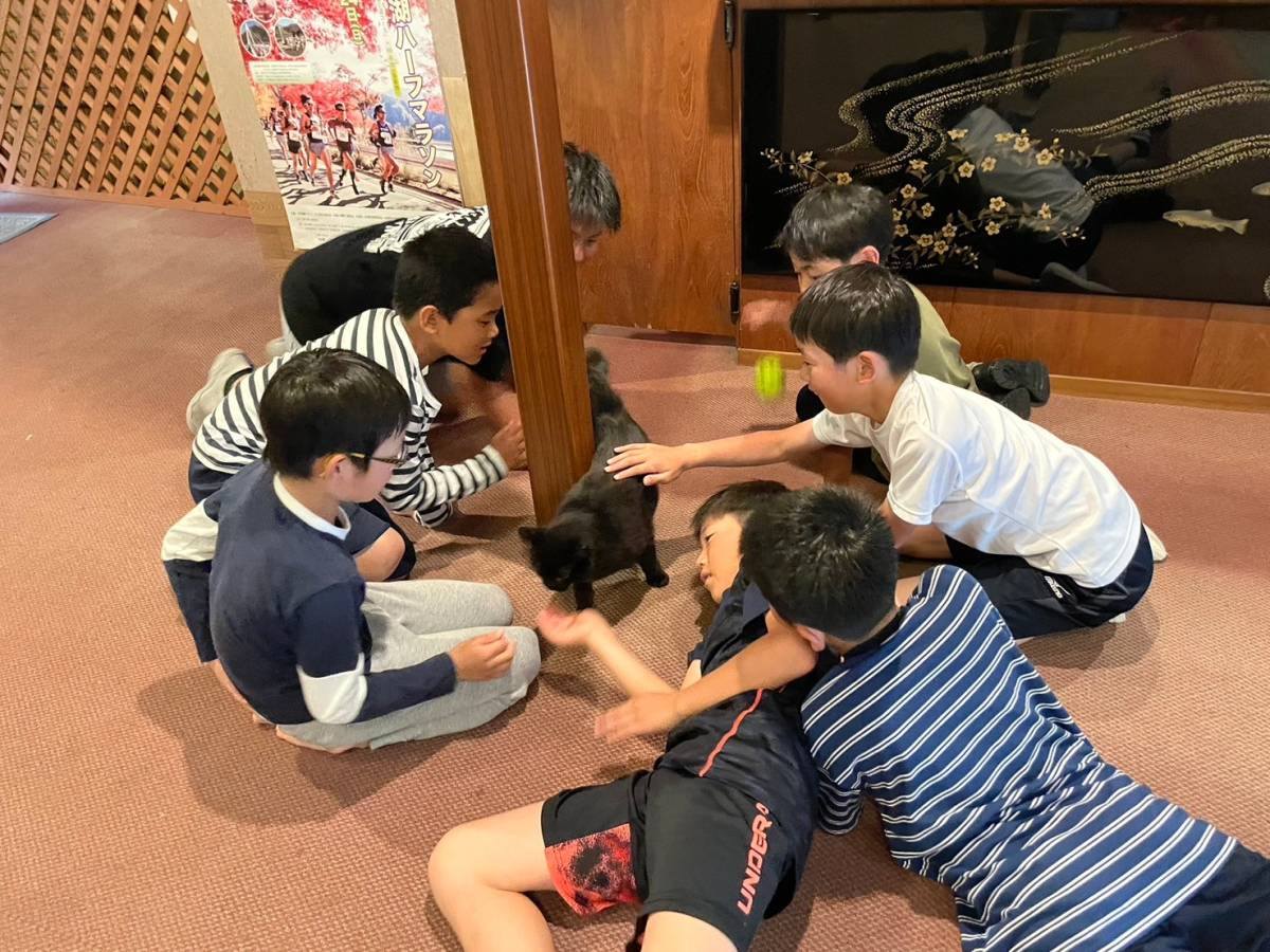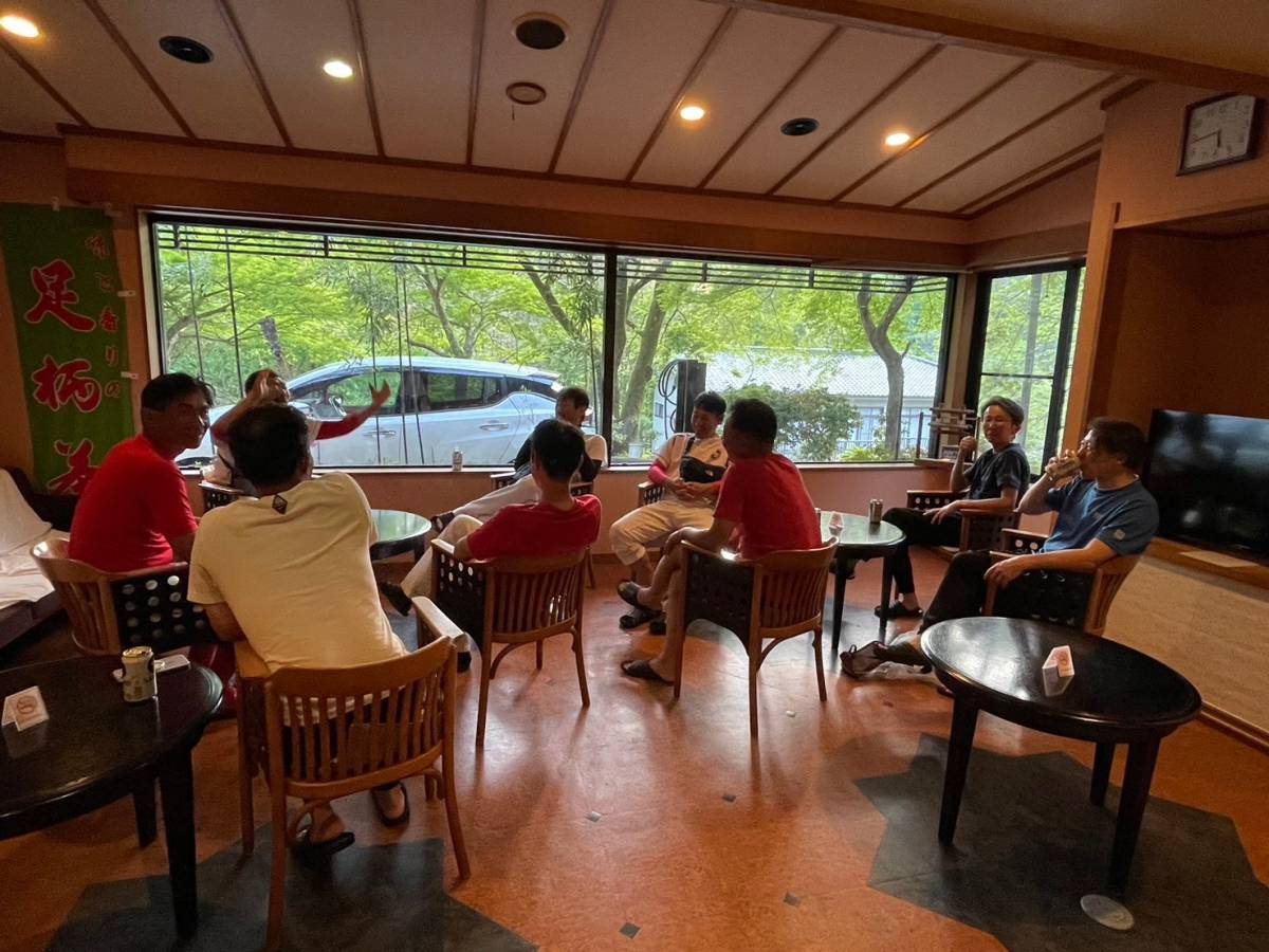 みんなと一緒にお風呂に入り、お宿の猫ちゃんに癒され、コーチたちは夕食前の一杯でほっと一息。