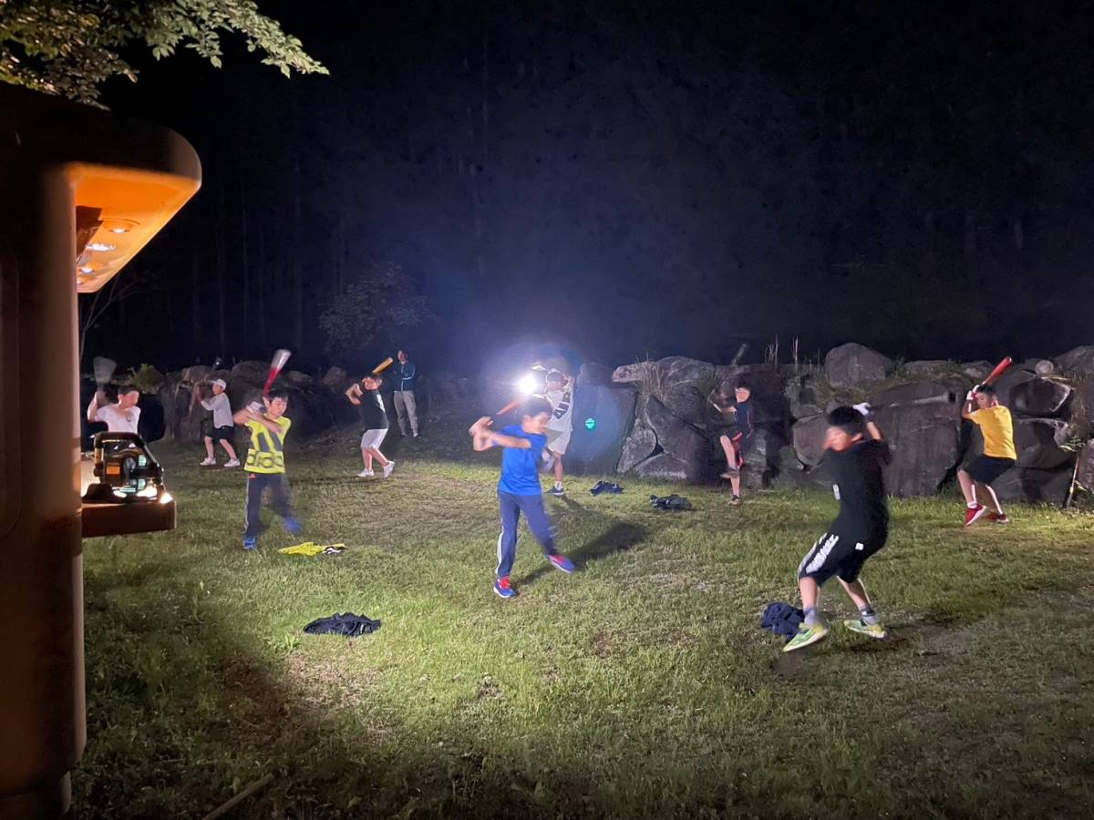 そして、夜の素振り。ライトに照らされながらの素振りは、つらいんだけれどもなんだかテンションが上がります。それもみんなと一緒だからだね!
